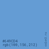 Цвет #649CD4 в цветовой модели RGB обозначается тремя октетами (100, 156, 212) в десятичном формате и #649CD4 в шестнадцатиричном (hex) формате, которые являются интенсивностью красного 100 (hex 64), интенсивность зелёного 156 (hex 9C) и интенсивность синего 212 (hex D4).