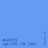 Цвет #649CF3 в цветовой модели RGB обозначается тремя октетами (100, 156, 243) в десятичном формате и #649CF3 в шестнадцатиричном (hex) формате, которые являются интенсивностью красного 100 (hex 64), интенсивность зелёного 156 (hex 9C) и интенсивность синего 243 (hex F3).