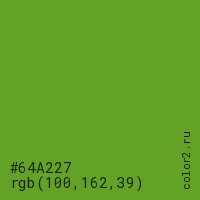 Цвет #64A227 в цветовой модели RGB обозначается тремя октетами (100, 162, 39) в десятичном формате и #64A227 в шестнадцатиричном (hex) формате, которые являются интенсивностью красного 100 (hex 64), интенсивность зелёного 162 (hex A2) и интенсивность синего 39 (hex 27).