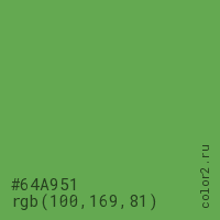 Цвет #64A951 в цветовой модели RGB обозначается тремя октетами (100, 169, 81) в десятичном формате и #64A951 в шестнадцатиричном (hex) формате, которые являются интенсивностью красного 100 (hex 64), интенсивность зелёного 169 (hex A9) и интенсивность синего 81 (hex 51).
