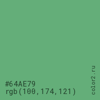 Цвет #64AE79 в цветовой модели RGB обозначается тремя октетами (100, 174, 121) в десятичном формате и #64AE79 в шестнадцатиричном (hex) формате, которые являются интенсивностью красного 100 (hex 64), интенсивность зелёного 174 (hex AE) и интенсивность синего 121 (hex 79).