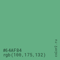 Цвет #64AF84 в цветовой модели RGB обозначается тремя октетами (100, 175, 132) в десятичном формате и #64AF84 в шестнадцатиричном (hex) формате, которые являются интенсивностью красного 100 (hex 64), интенсивность зелёного 175 (hex AF) и интенсивность синего 132 (hex 84).