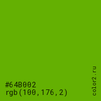Цвет #64B002 в цветовой модели RGB обозначается тремя октетами (100, 176, 2) в десятичном формате и #64B002 в шестнадцатиричном (hex) формате, которые являются интенсивностью красного 100 (hex 64), интенсивность зелёного 176 (hex B0) и интенсивность синего 2 (hex 02).