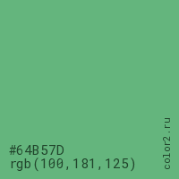Цвет #64B57D в цветовой модели RGB обозначается тремя октетами (100, 181, 125) в десятичном формате и #64B57D в шестнадцатиричном (hex) формате, которые являются интенсивностью красного 100 (hex 64), интенсивность зелёного 181 (hex B5) и интенсивность синего 125 (hex 7D).