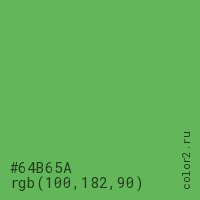 Цвет #64B65A в цветовой модели RGB обозначается тремя октетами (100, 182, 90) в десятичном формате и #64B65A в шестнадцатиричном (hex) формате, которые являются интенсивностью красного 100 (hex 64), интенсивность зелёного 182 (hex B6) и интенсивность синего 90 (hex 5A).