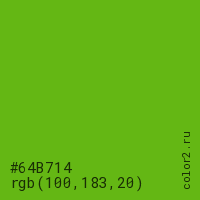 Цвет #64B714 в цветовой модели RGB обозначается тремя октетами (100, 183, 20) в десятичном формате и #64B714 в шестнадцатиричном (hex) формате, которые являются интенсивностью красного 100 (hex 64), интенсивность зелёного 183 (hex B7) и интенсивность синего 20 (hex 14).