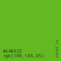 Цвет #64B923 в цветовой модели RGB обозначается тремя октетами (100, 185, 35) в десятичном формате и #64B923 в шестнадцатиричном (hex) формате, которые являются интенсивностью красного 100 (hex 64), интенсивность зелёного 185 (hex B9) и интенсивность синего 35 (hex 23).