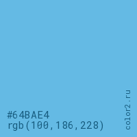 Цвет #64BAE4 в цветовой модели RGB обозначается тремя октетами (100, 186, 228) в десятичном формате и #64BAE4 в шестнадцатиричном (hex) формате, которые являются интенсивностью красного 100 (hex 64), интенсивность зелёного 186 (hex BA) и интенсивность синего 228 (hex E4).