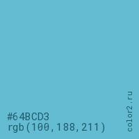 Цвет #64BCD3 в цветовой модели RGB обозначается тремя октетами (100, 188, 211) в десятичном формате и #64BCD3 в шестнадцатиричном (hex) формате, которые являются интенсивностью красного 100 (hex 64), интенсивность зелёного 188 (hex BC) и интенсивность синего 211 (hex D3).