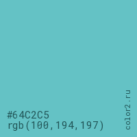 Цвет #64C2C5 в цветовой модели RGB обозначается тремя октетами (100, 194, 197) в десятичном формате и #64C2C5 в шестнадцатиричном (hex) формате, которые являются интенсивностью красного 100 (hex 64), интенсивность зелёного 194 (hex C2) и интенсивность синего 197 (hex C5).