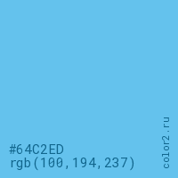 Цвет #64C2ED в цветовой модели RGB обозначается тремя октетами (100, 194, 237) в десятичном формате и #64C2ED в шестнадцатиричном (hex) формате, которые являются интенсивностью красного 100 (hex 64), интенсивность зелёного 194 (hex C2) и интенсивность синего 237 (hex ED).