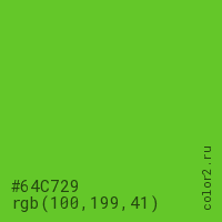 Цвет #64C729 в цветовой модели RGB обозначается тремя октетами (100, 199, 41) в десятичном формате и #64C729 в шестнадцатиричном (hex) формате, которые являются интенсивностью красного 100 (hex 64), интенсивность зелёного 199 (hex C7) и интенсивность синего 41 (hex 29).