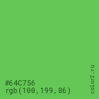 Цвет #64C756 в цветовой модели RGB обозначается тремя октетами (100, 199, 86) в десятичном формате и #64C756 в шестнадцатиричном (hex) формате, которые являются интенсивностью красного 100 (hex 64), интенсивность зелёного 199 (hex C7) и интенсивность синего 86 (hex 56).