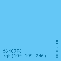 Цвет #64C7F6 в цветовой модели RGB обозначается тремя октетами (100, 199, 246) в десятичном формате и #64C7F6 в шестнадцатиричном (hex) формате, которые являются интенсивностью красного 100 (hex 64), интенсивность зелёного 199 (hex C7) и интенсивность синего 246 (hex F6).