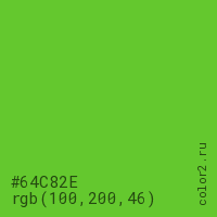 Цвет #64C82E в цветовой модели RGB обозначается тремя октетами (100, 200, 46) в десятичном формате и #64C82E в шестнадцатиричном (hex) формате, которые являются интенсивностью красного 100 (hex 64), интенсивность зелёного 200 (hex C8) и интенсивность синего 46 (hex 2E).