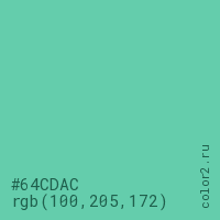 Цвет #64CDAC в цветовой модели RGB обозначается тремя октетами (100, 205, 172) в десятичном формате и #64CDAC в шестнадцатиричном (hex) формате, которые являются интенсивностью красного 100 (hex 64), интенсивность зелёного 205 (hex CD) и интенсивность синего 172 (hex AC).