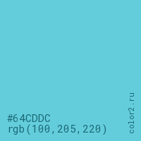 Цвет #64CDDC в цветовой модели RGB обозначается тремя октетами (100, 205, 220) в десятичном формате и #64CDDC в шестнадцатиричном (hex) формате, которые являются интенсивностью красного 100 (hex 64), интенсивность зелёного 205 (hex CD) и интенсивность синего 220 (hex DC).