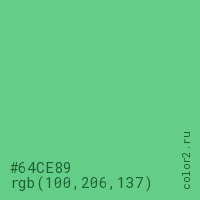 Цвет #64CE89 в цветовой модели RGB обозначается тремя октетами (100, 206, 137) в десятичном формате и #64CE89 в шестнадцатиричном (hex) формате, которые являются интенсивностью красного 100 (hex 64), интенсивность зелёного 206 (hex CE) и интенсивность синего 137 (hex 89).