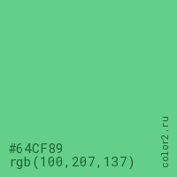 Цвет #64CF89 в цветовой модели RGB обозначается тремя октетами (100, 207, 137) в десятичном формате и #64CF89 в шестнадцатиричном (hex) формате, которые являются интенсивностью красного 100 (hex 64), интенсивность зелёного 207 (hex CF) и интенсивность синего 137 (hex 89).
