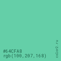 Цвет #64CFA8 в цветовой модели RGB обозначается тремя октетами (100, 207, 168) в десятичном формате и #64CFA8 в шестнадцатиричном (hex) формате, которые являются интенсивностью красного 100 (hex 64), интенсивность зелёного 207 (hex CF) и интенсивность синего 168 (hex A8).