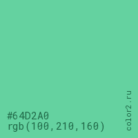 Цвет #64D2A0 в цветовой модели RGB обозначается тремя октетами (100, 210, 160) в десятичном формате и #64D2A0 в шестнадцатиричном (hex) формате, которые являются интенсивностью красного 100 (hex 64), интенсивность зелёного 210 (hex D2) и интенсивность синего 160 (hex A0).