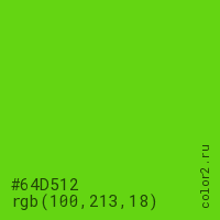 Цвет #64D512 в цветовой модели RGB обозначается тремя октетами (100, 213, 18) в десятичном формате и #64D512 в шестнадцатиричном (hex) формате, которые являются интенсивностью красного 100 (hex 64), интенсивность зелёного 213 (hex D5) и интенсивность синего 18 (hex 12).