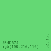 Цвет #64D874 в цветовой модели RGB обозначается тремя октетами (100, 216, 116) в десятичном формате и #64D874 в шестнадцатиричном (hex) формате, которые являются интенсивностью красного 100 (hex 64), интенсивность зелёного 216 (hex D8) и интенсивность синего 116 (hex 74).