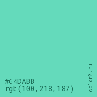 Цвет #64DABB в цветовой модели RGB обозначается тремя октетами (100, 218, 187) в десятичном формате и #64DABB в шестнадцатиричном (hex) формате, которые являются интенсивностью красного 100 (hex 64), интенсивность зелёного 218 (hex DA) и интенсивность синего 187 (hex BB).