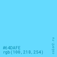 Цвет #64DAFE в цветовой модели RGB обозначается тремя октетами (100, 218, 254) в десятичном формате и #64DAFE в шестнадцатиричном (hex) формате, которые являются интенсивностью красного 100 (hex 64), интенсивность зелёного 218 (hex DA) и интенсивность синего 254 (hex FE).