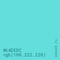 Цвет #64DEDC в цветовой модели RGB обозначается тремя октетами (100, 222, 220) в десятичном формате и #64DEDC в шестнадцатиричном (hex) формате, которые являются интенсивностью красного 100 (hex 64), интенсивность зелёного 222 (hex DE) и интенсивность синего 220 (hex DC).