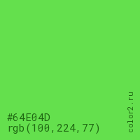Цвет #64E04D в цветовой модели RGB обозначается тремя октетами (100, 224, 77) в десятичном формате и #64E04D в шестнадцатиричном (hex) формате, которые являются интенсивностью красного 100 (hex 64), интенсивность зелёного 224 (hex E0) и интенсивность синего 77 (hex 4D).