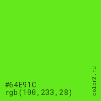 Цвет #64E91C в цветовой модели RGB обозначается тремя октетами (100, 233, 28) в десятичном формате и #64E91C в шестнадцатиричном (hex) формате, которые являются интенсивностью красного 100 (hex 64), интенсивность зелёного 233 (hex E9) и интенсивность синего 28 (hex 1C).