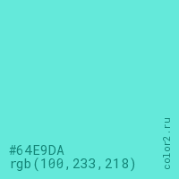 Цвет #64E9DA в цветовой модели RGB обозначается тремя октетами (100, 233, 218) в десятичном формате и #64E9DA в шестнадцатиричном (hex) формате, которые являются интенсивностью красного 100 (hex 64), интенсивность зелёного 233 (hex E9) и интенсивность синего 218 (hex DA).