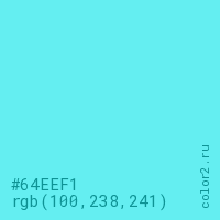 Цвет #64EEF1 в цветовой модели RGB обозначается тремя октетами (100, 238, 241) в десятичном формате и #64EEF1 в шестнадцатиричном (hex) формате, которые являются интенсивностью красного 100 (hex 64), интенсивность зелёного 238 (hex EE) и интенсивность синего 241 (hex F1).
