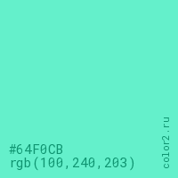 Цвет #64F0CB в цветовой модели RGB обозначается тремя октетами (100, 240, 203) в десятичном формате и #64F0CB в шестнадцатиричном (hex) формате, которые являются интенсивностью красного 100 (hex 64), интенсивность зелёного 240 (hex F0) и интенсивность синего 203 (hex CB).