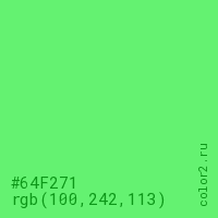Цвет #64F271 в цветовой модели RGB обозначается тремя октетами (100, 242, 113) в десятичном формате и #64F271 в шестнадцатиричном (hex) формате, которые являются интенсивностью красного 100 (hex 64), интенсивность зелёного 242 (hex F2) и интенсивность синего 113 (hex 71).