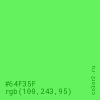 Цвет #64F35F в цветовой модели RGB обозначается тремя октетами (100, 243, 95) в десятичном формате и #64F35F в шестнадцатиричном (hex) формате, которые являются интенсивностью красного 100 (hex 64), интенсивность зелёного 243 (hex F3) и интенсивность синего 95 (hex 5F).