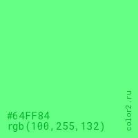 Цвет #64FF84 в цветовой модели RGB обозначается тремя октетами (100, 255, 132) в десятичном формате и #64FF84 в шестнадцатиричном (hex) формате, которые являются интенсивностью красного 100 (hex 64), интенсивность зелёного 255 (hex FF) и интенсивность синего 132 (hex 84).