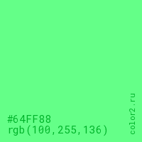 Цвет #64FF88 в цветовой модели RGB обозначается тремя октетами (100, 255, 136) в десятичном формате и #64FF88 в шестнадцатиричном (hex) формате, которые являются интенсивностью красного 100 (hex 64), интенсивность зелёного 255 (hex FF) и интенсивность синего 136 (hex 88).