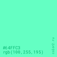 Цвет #64FFC3 в цветовой модели RGB обозначается тремя октетами (100, 255, 195) в десятичном формате и #64FFC3 в шестнадцатиричном (hex) формате, которые являются интенсивностью красного 100 (hex 64), интенсивность зелёного 255 (hex FF) и интенсивность синего 195 (hex C3).