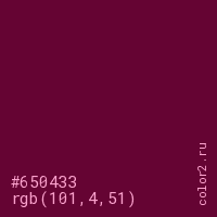 Цвет #650433 в цветовой модели RGB обозначается тремя октетами (101, 4, 51) в десятичном формате и #650433 в шестнадцатиричном (hex) формате, которые являются интенсивностью красного 101 (hex 65), интенсивность зелёного 4 (hex 04) и интенсивность синего 51 (hex 33).