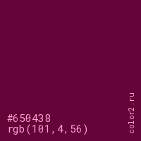 Цвет #650438 в цветовой модели RGB обозначается тремя октетами (101, 4, 56) в десятичном формате и #650438 в шестнадцатиричном (hex) формате, которые являются интенсивностью красного 101 (hex 65), интенсивность зелёного 4 (hex 04) и интенсивность синего 56 (hex 38).