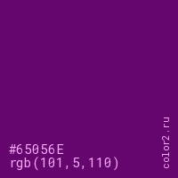 Цвет #65056E в цветовой модели RGB обозначается тремя октетами (101, 5, 110) в десятичном формате и #65056E в шестнадцатиричном (hex) формате, которые являются интенсивностью красного 101 (hex 65), интенсивность зелёного 5 (hex 05) и интенсивность синего 110 (hex 6E).