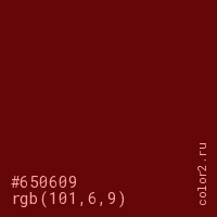 Цвет #650609 в цветовой модели RGB обозначается тремя октетами (101, 6, 9) в десятичном формате и #650609 в шестнадцатиричном (hex) формате, которые являются интенсивностью красного 101 (hex 65), интенсивность зелёного 6 (hex 06) и интенсивность синего 9 (hex 09).