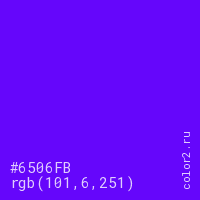 Цвет #6506FB в цветовой модели RGB обозначается тремя октетами (101, 6, 251) в десятичном формате и #6506FB в шестнадцатиричном (hex) формате, которые являются интенсивностью красного 101 (hex 65), интенсивность зелёного 6 (hex 06) и интенсивность синего 251 (hex FB).