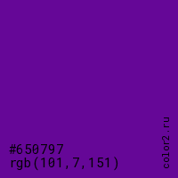 Цвет #650797 в цветовой модели RGB обозначается тремя октетами (101, 7, 151) в десятичном формате и #650797 в шестнадцатиричном (hex) формате, которые являются интенсивностью красного 101 (hex 65), интенсивность зелёного 7 (hex 07) и интенсивность синего 151 (hex 97).