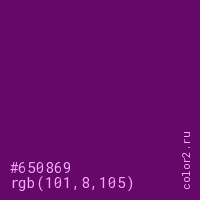 Цвет #650869 в цветовой модели RGB обозначается тремя октетами (101, 8, 105) в десятичном формате и #650869 в шестнадцатиричном (hex) формате, которые являются интенсивностью красного 101 (hex 65), интенсивность зелёного 8 (hex 08) и интенсивность синего 105 (hex 69).
