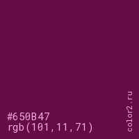 Цвет #650B47 в цветовой модели RGB обозначается тремя октетами (101, 11, 71) в десятичном формате и #650B47 в шестнадцатиричном (hex) формате, которые являются интенсивностью красного 101 (hex 65), интенсивность зелёного 11 (hex 0B) и интенсивность синего 71 (hex 47).