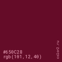 Цвет #650C28 в цветовой модели RGB обозначается тремя октетами (101, 12, 40) в десятичном формате и #650C28 в шестнадцатиричном (hex) формате, которые являются интенсивностью красного 101 (hex 65), интенсивность зелёного 12 (hex 0C) и интенсивность синего 40 (hex 28).