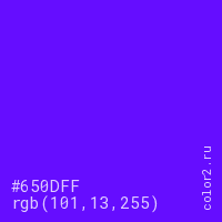 Цвет #650DFF в цветовой модели RGB обозначается тремя октетами (101, 13, 255) в десятичном формате и #650DFF в шестнадцатиричном (hex) формате, которые являются интенсивностью красного 101 (hex 65), интенсивность зелёного 13 (hex 0D) и интенсивность синего 255 (hex FF).